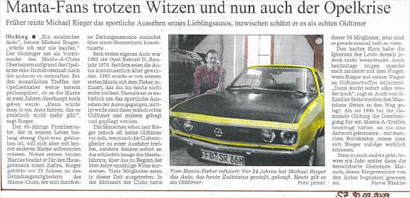 Im Rahmen des Club Stammtisches am 12. Oktober 2008, drehte das Bayrische Fernsehen einen Beitrag über den Manta A Club Oberbayern. Dieser wurde zeitnah schon am nächsten Tag im Bayrischen Fernsehen gesendet.