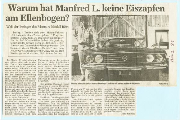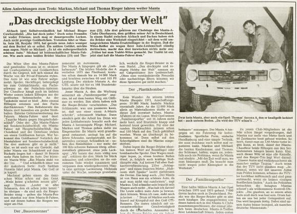1991 erschien von der Zeitschrift "Sport Auto" eine Spezialausgabe in der es um Opel Tuning ging. Hauptsächlich ging es damals natürlich um Calibra, Omega, E-Kadett und weitere Opelfahrzeuge aus dieser Zeit. Ein Vertreter der Siebziger war der grüne Manta A eines ehemaligen Clubmitgliedes der hier auch an anderer Stelle schon gezeigt wird. Auf 4 Seiten wird über den 6-Zylinder Umbau kurz und bündig mit sehr schönen Bildaufnahmen berichtet.
